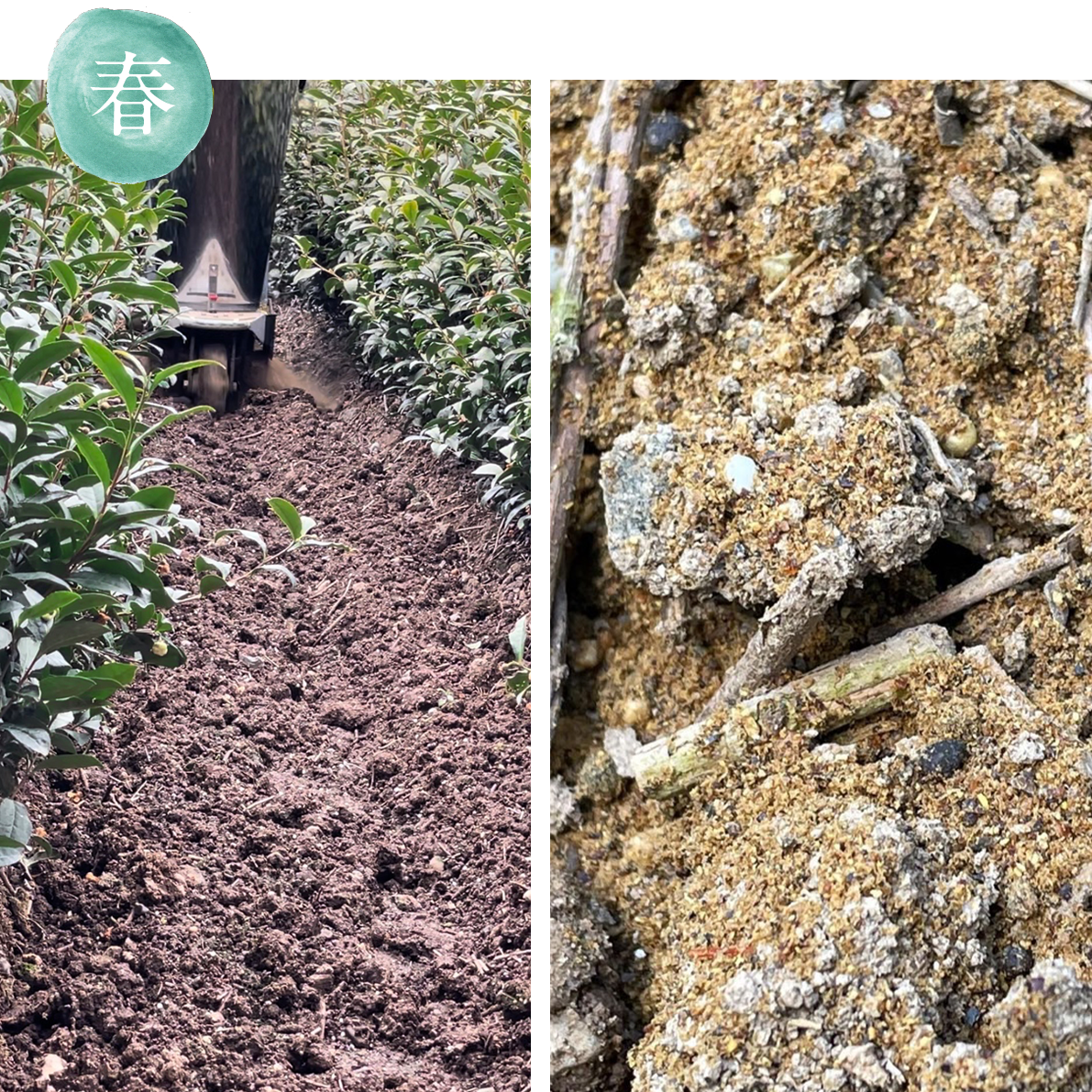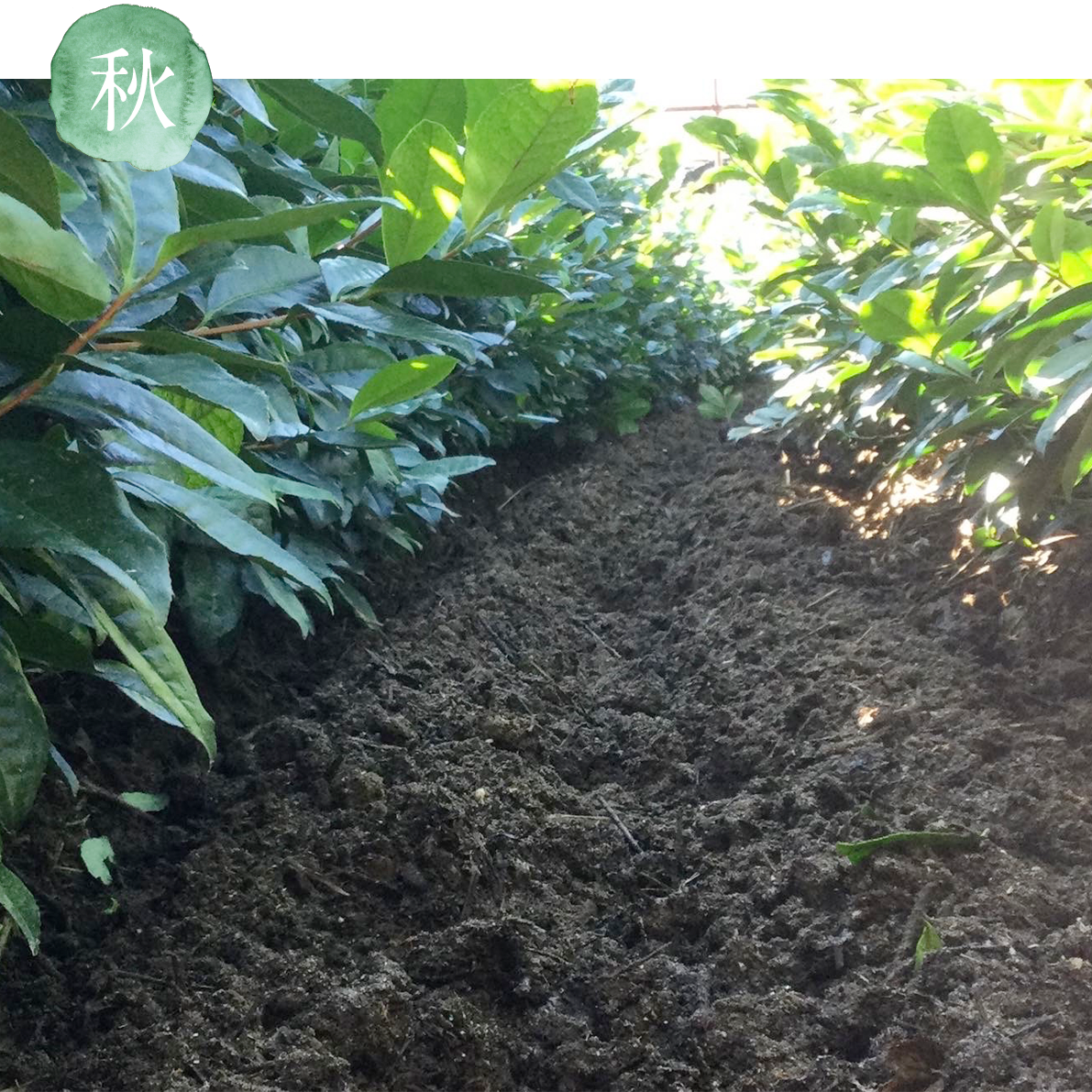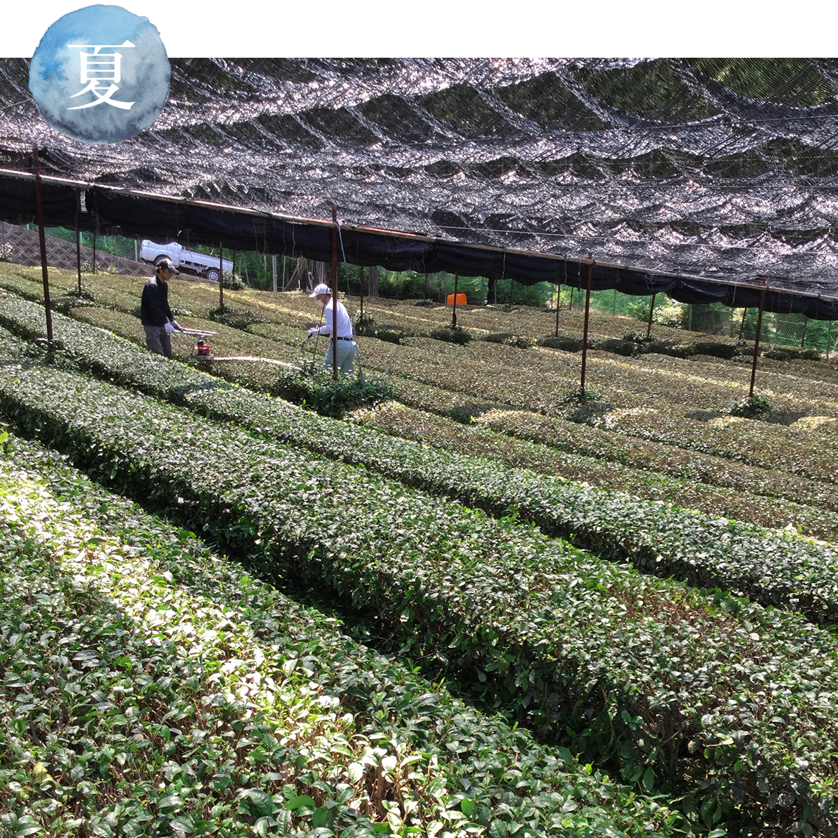 In early spring, we apply our homemade organic fertilizer, which contains fish meal and brown sugar. As new buds begin to sprout, we cover the tea fields with Kanreisha. Depending on the weather, temperature, and the condition of the new buds, we adjust the Kanreisha with single or double layers and side covers. Shading the fields encourages the production of the amino acid theanine, resulting in tea leaves with a unique fragrance. And finally, we reach the tea picking season in May.
