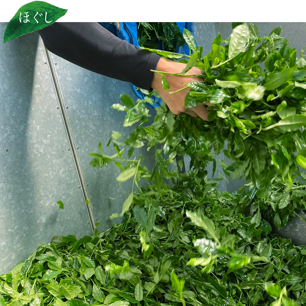The leaves begin to deteriorate once picked, so immediately transported to the tea factory, where they are spread out and separated into containers. These containers are ventilated to prevent the new leaves from deteriorating or wilting. The freshly picked buds are placed into the “Nagashi”, first stage of the tea factory process, where they are further separated and sent to the next process.