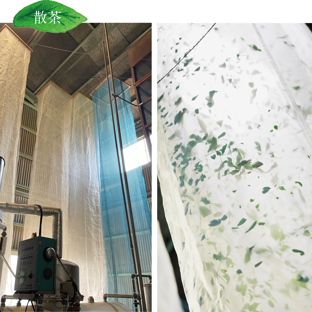 The steamed leaves are blown up with wind power in a cooling machine for separation of Tea leaves covered with a 5-meter-high net called an "Andon." In order to prevent discoloration, this process quickly makes the leaves cooler, spreads them out, and removes excess moisture.