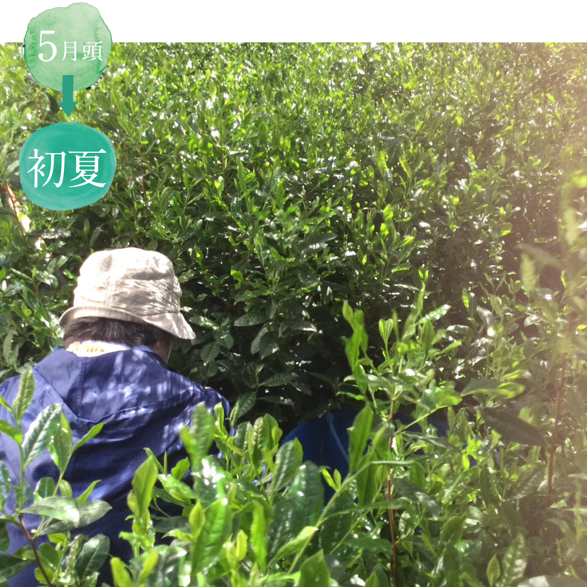 Tea picking starts in May. At this time, the tea bushes have grown to about waist height, because we do not prune them, allowing them to grow naturally. The new buds sprout freely all over the bushes, often hiding the tea pickers who are called “Tsumiko” from view, and this is a unique sight in Uji because of the "natural shaping" tea farms. Tsumiko carefully hand-pick the new buds, which are rich in nutrients from the fertilizers applied throughout the year.