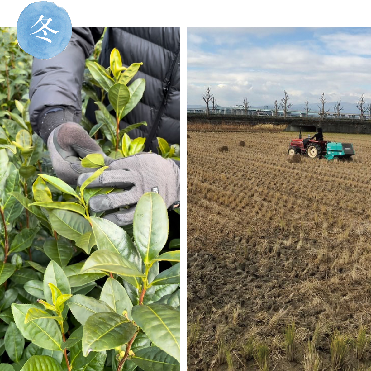 Winter's customary task is "bud pinching," which promotes the growth of side shoots by removing the top buds. This results in the unique naturally shaped tea bushes that sprout new buds from the base in spring. Because the tea field is massive, we do this bud pinching with the entire family. Another important winter task is collecting straw, which is used for drought prevention and weed control in the tea gardens during the summer.