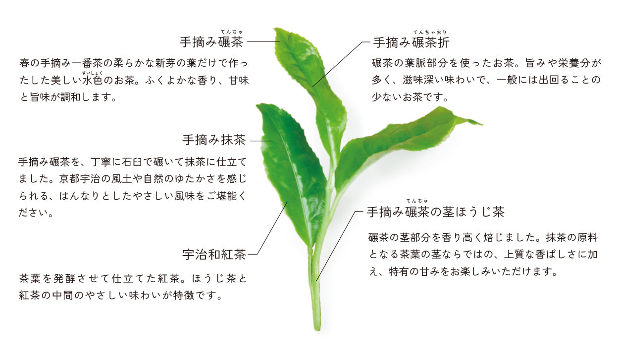 葉部分は「碾茶」に、 葉脈部分は「碾茶折」に、茎部分は「茎ほうじ茶」に仕立てられます。