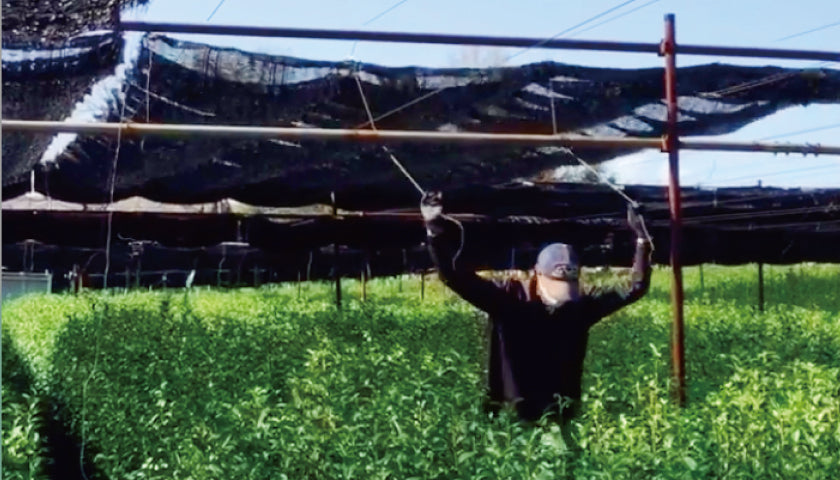 そして、新芽の芽吹く頃、茶畑を寒冷紗で覆います。天候や、気温、その年の新芽の状態を見きわめて、一重覆い、二重覆い、側面の覆いと、状況に応じて寒冷紗を広げていきます。